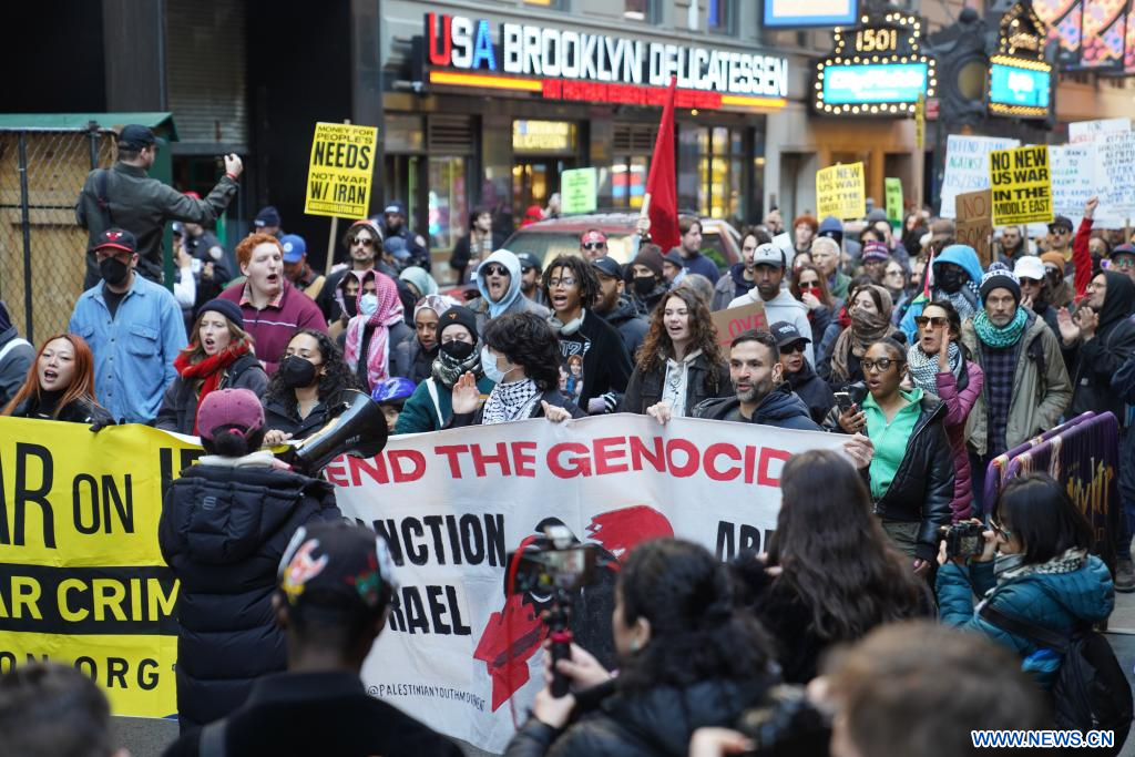 Des centaines de New-Yorkais se sont rassemblés à Times Square puis ont défilé dans les rues de New York pour dénoncer les frappes aériennes coordonnées par les Etats-Unis et Israël contre l'Iran samedi. (Xinhua/Zhang Fengguo)