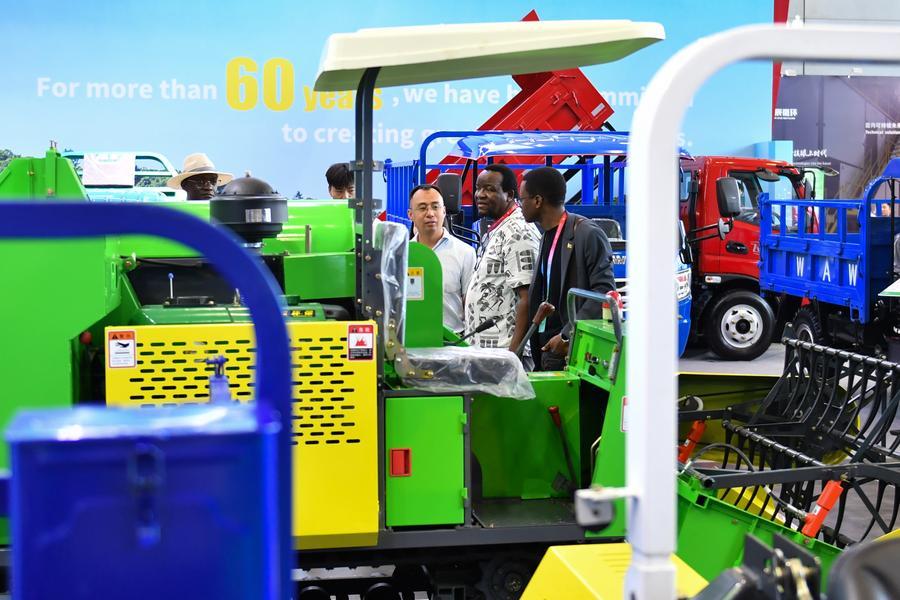 Des visiteurs se renseignent sur des machines agricoles lors de la 4e Exposition économique et commerciale Chine-Afrique, au Centre international des expositions et des congrès de Changsha, à Changsha, dans la province chinoise du Hunan (centre), le 14 juin 2025. (Photo : Chen Zhenhai)