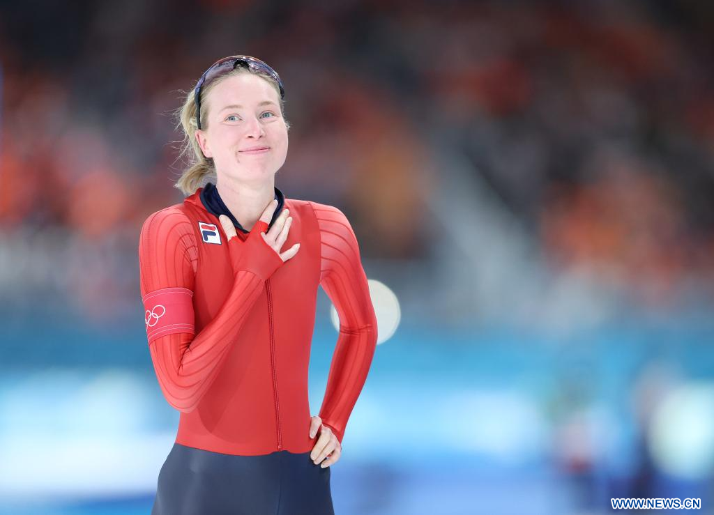 MILAN, 7 février 2026 (Xinhua) -- La Norvégienne Ragne Wiklund réagit après la finale du 3.000 m féminin de patinage de vitesse aux Jeux olympiques d'hiver Milan-Cortina 2026, à Milan, en Italie, le 7 février 2026. (Xinhua/Du Xiaoyi)